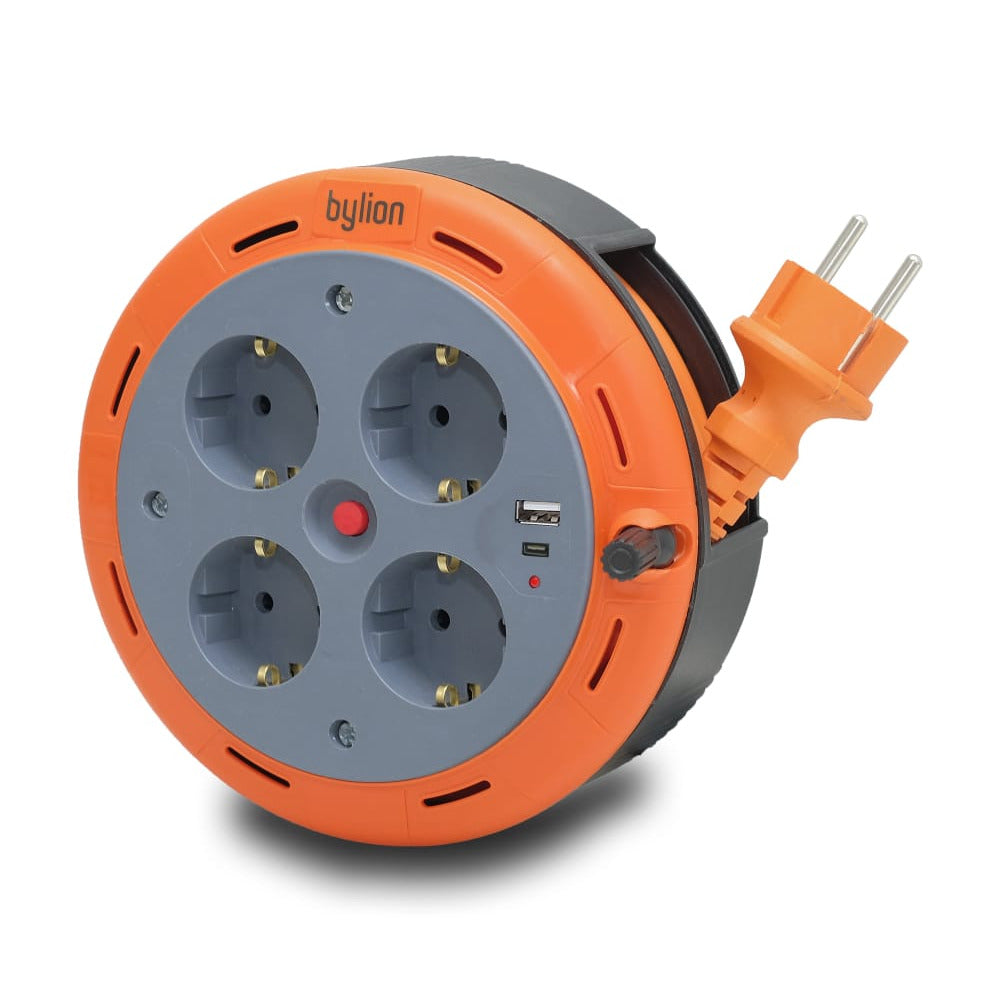 This model features four sockets and a durable H05VV-F cable with a cross-section of 3G1.00mm² and a length of 5 meters, providing sufficient range for various applications. The orange color of the cable enhances its visibility, contributing to safety during use. With this reel, you ensure easy and quick connection and disconnection of devices, as well as the removal of cable clutter, and the presence of USB connectors allows you to charge your smartphone or other electronic devices without a charger.
