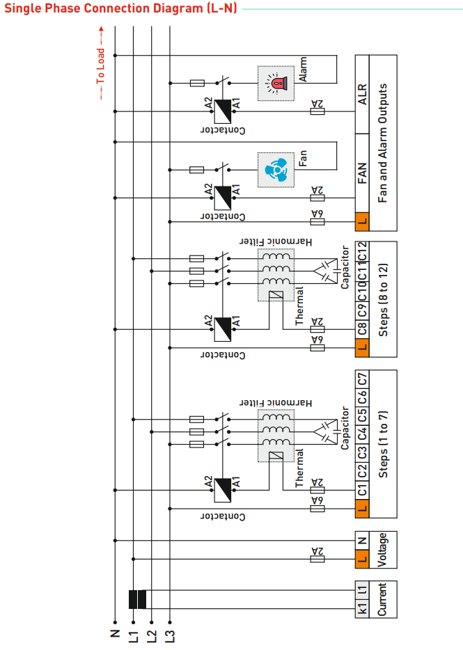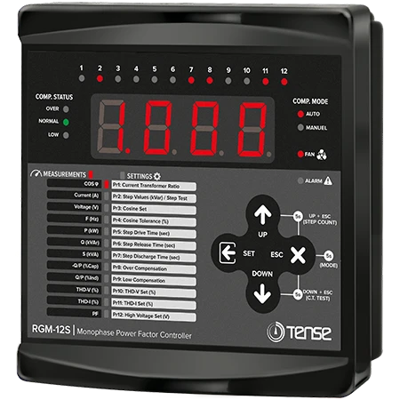 12 steps Single-phase connection Power factor controller for managing power factor in networks with balanced loads (TENSE)
