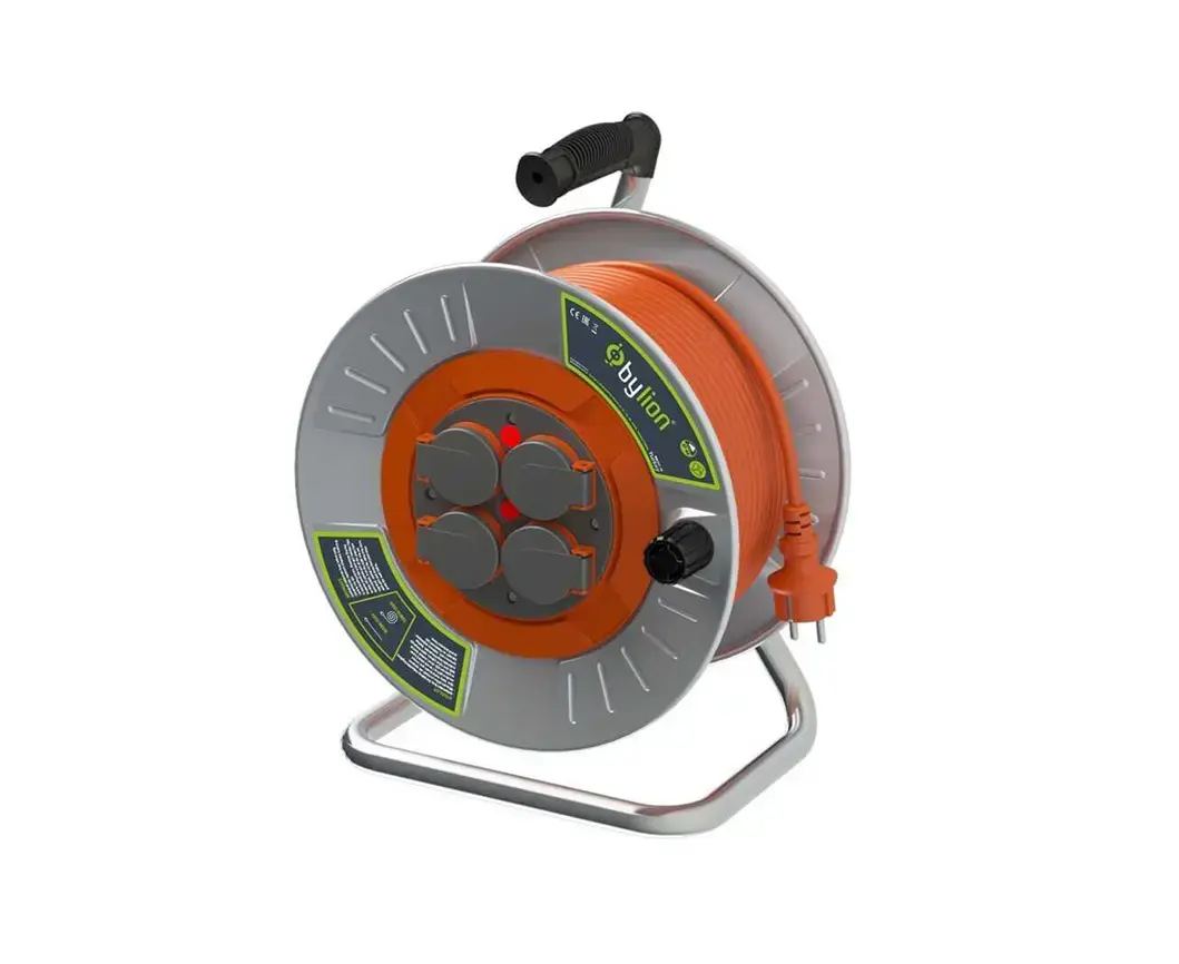 Макара ByLion MMP-50325-F - 50 m, 3×2,5 mm², метална, 4 гнезда, IP44 Професионалната удължителна макара ByLion е надеждно решение за взискателни приложения в промишлеността, строителството, работилницата и дома. Предимства. Технически параметри: Производител: ByLion Заземяване: да Дължина на кабела: 50 м Сечение на проводника: 3×2,5 mm² Гнездо тип E - френско със заземителен щифт. Брой гнезда: 4 (тип 2P+E) Степен на защита: IP44 Предупреждение.
