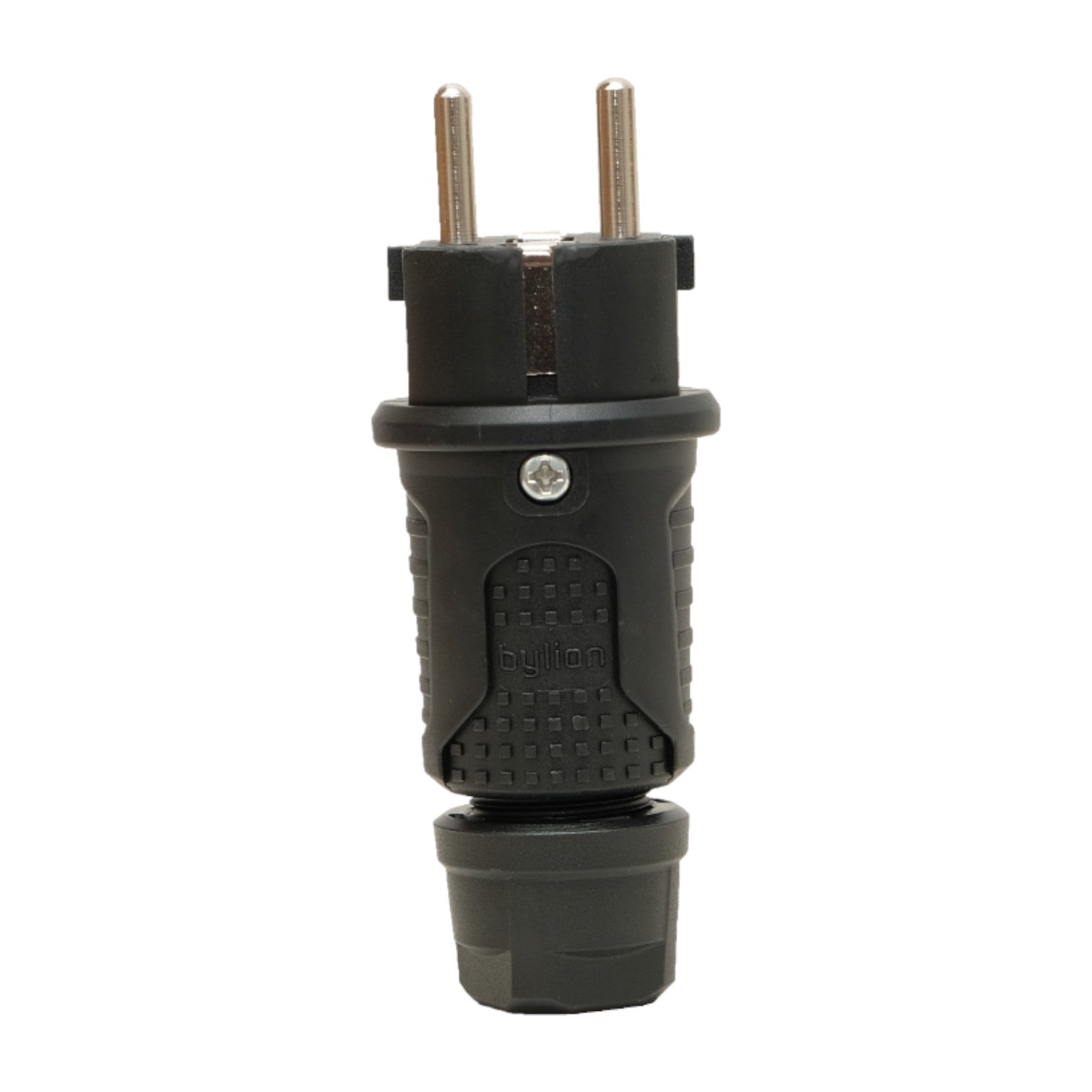Black rubber plug IP54, 250v 16a on cable, Uni-Schuko (double grounding), 2P+E, REF, Bylion
