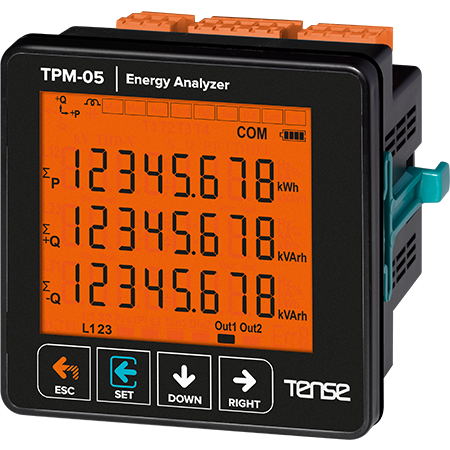 3-phase network parameters analyzer - three-phase multifunctional digital panel measuring device, indicator for current, voltage, frequency, and total power, with two relay outputs and a digital input, RS485 ModBus RTU - panel measuring devices from the manufacturer TPM-05 TENSE (Turkey).