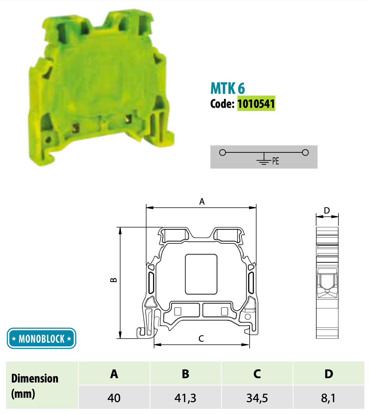 ONKA 6mm2 PE Screw connector for bus Terminal box for DIN rail 2-wire terminal, gray, 1010541