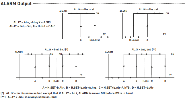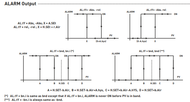 Relay outputs OUT and ALARM (NO+NC) 250 VAC, 2A (ALARM ON only with DT-48Y)