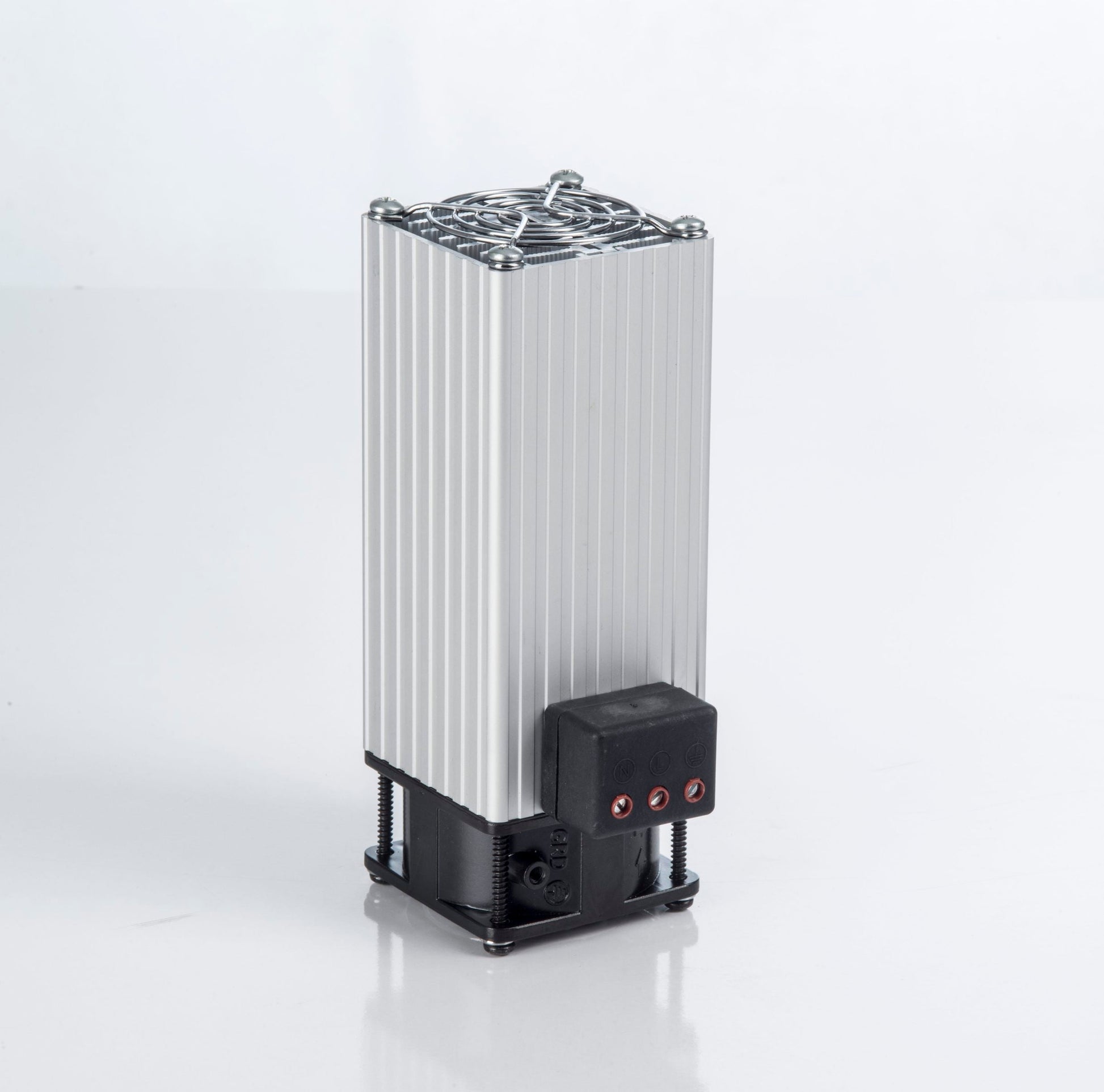 Electric heater (PTC Body Heater, post-tension heater) for distribution panels with a fan, with an anodized aluminum radiator and overcurrent protection, for DIN rail mounting, 100 W, 220/230 V AC, PFHT100, Plastim - made in Turkey.