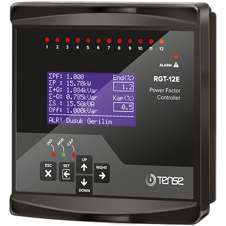 The reactive power controller RGT-12E (TENSE) is a fully automatic device for optimal switching of compensation steps.